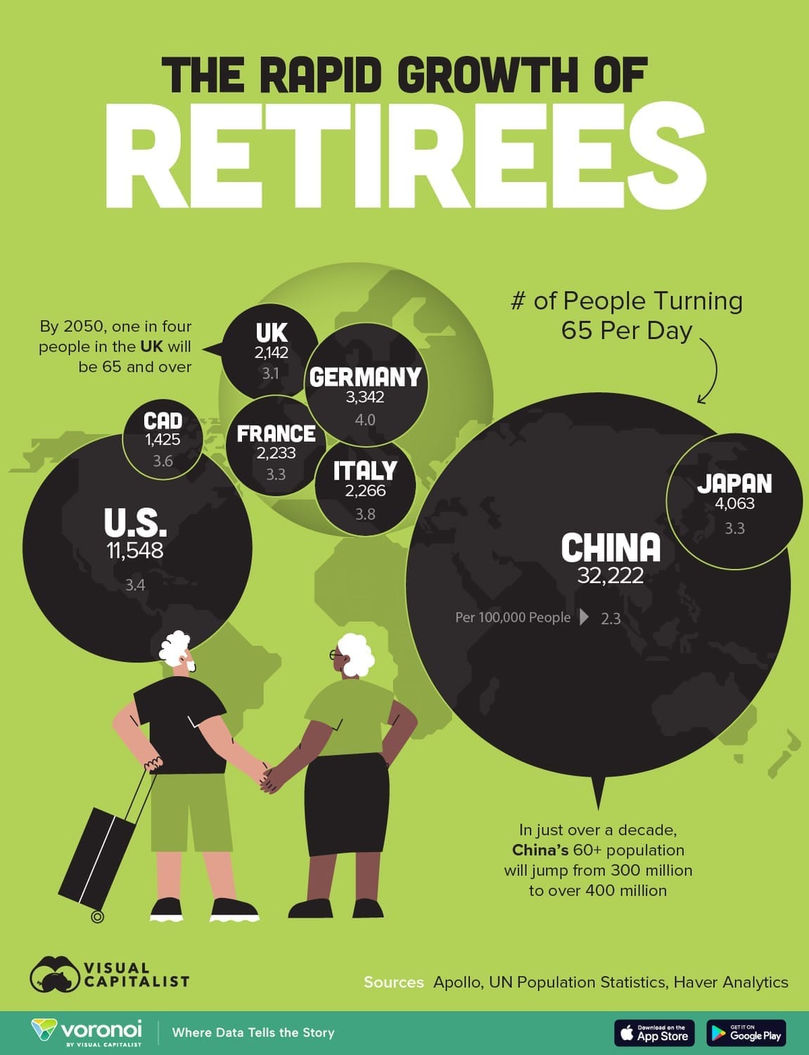 By one estimate, a record 4.1 million people will turn 65 annually through 2027. In many of the world’s largest economies, aging populations are putting increasing pressure on retirement systems amid declining birth rates and mounting debt.